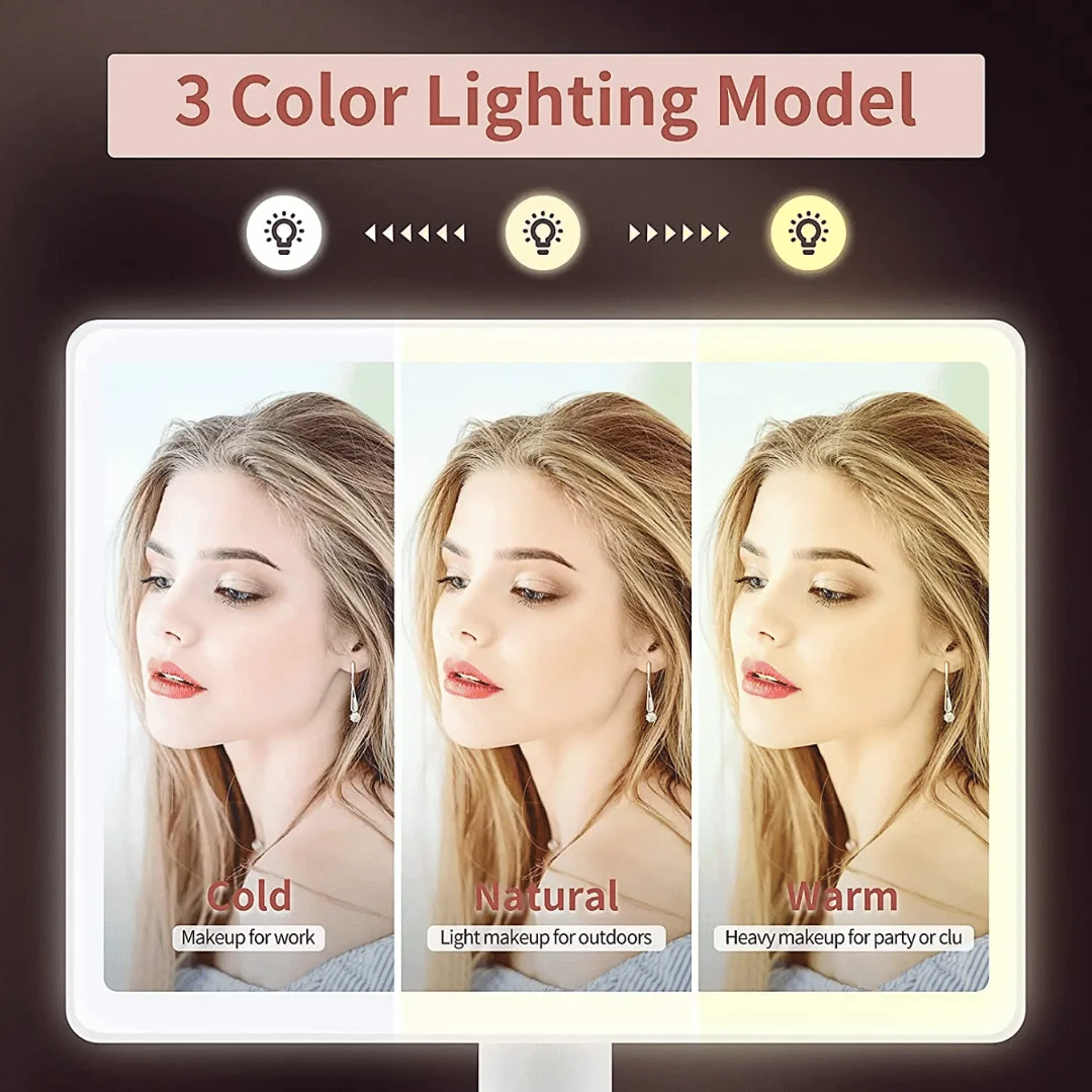 Transform your daily beauty routine with the LED Makeup Mirror, a sophisticated addition to your dressing table that offers impeccable clarity and versatile lighting. Designed to meet your every need, this mirror features three adjustable color settings—warm, daylight, and cold light—each with dimmable brightness levels (low, medium, high), ensuring you always have the perfect lighting for any occasion.