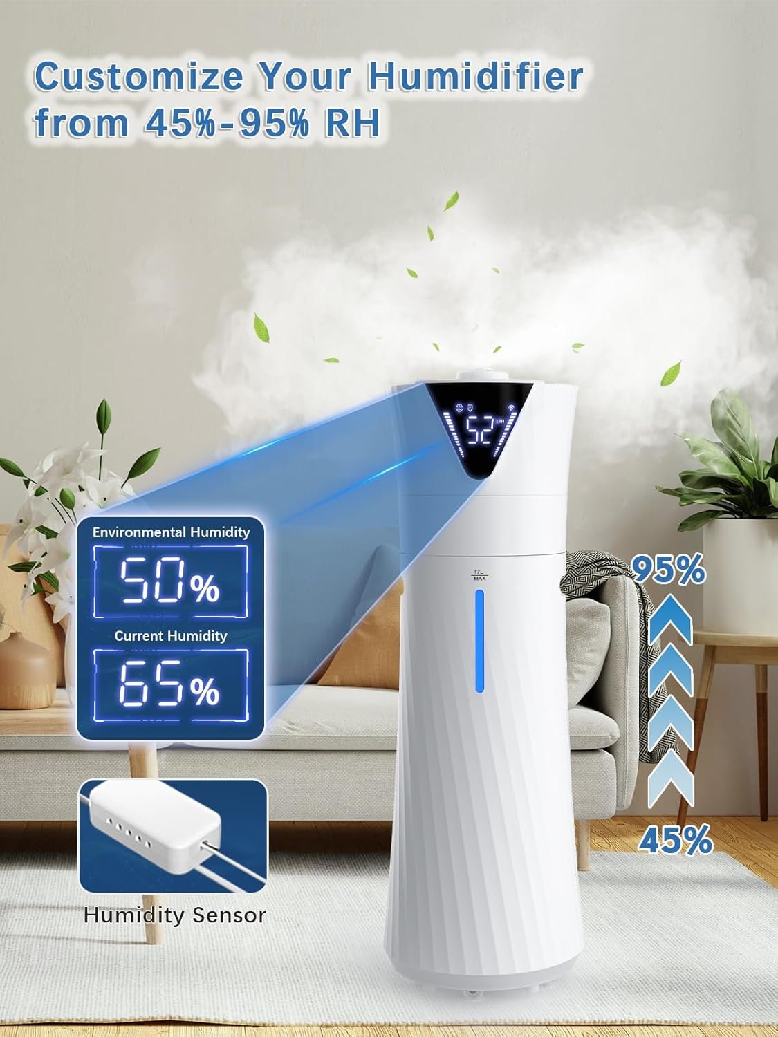 Its modern design features a digital display for instant humidity readings. The large room humidifier gives you more ways to customize humidity to your lifestyle, including manual mode (allowing you to set the target humidity between 45% and 95%), three cold mist modes, and sleep mode (which turns off the screen for a peaceful night’s sleep).