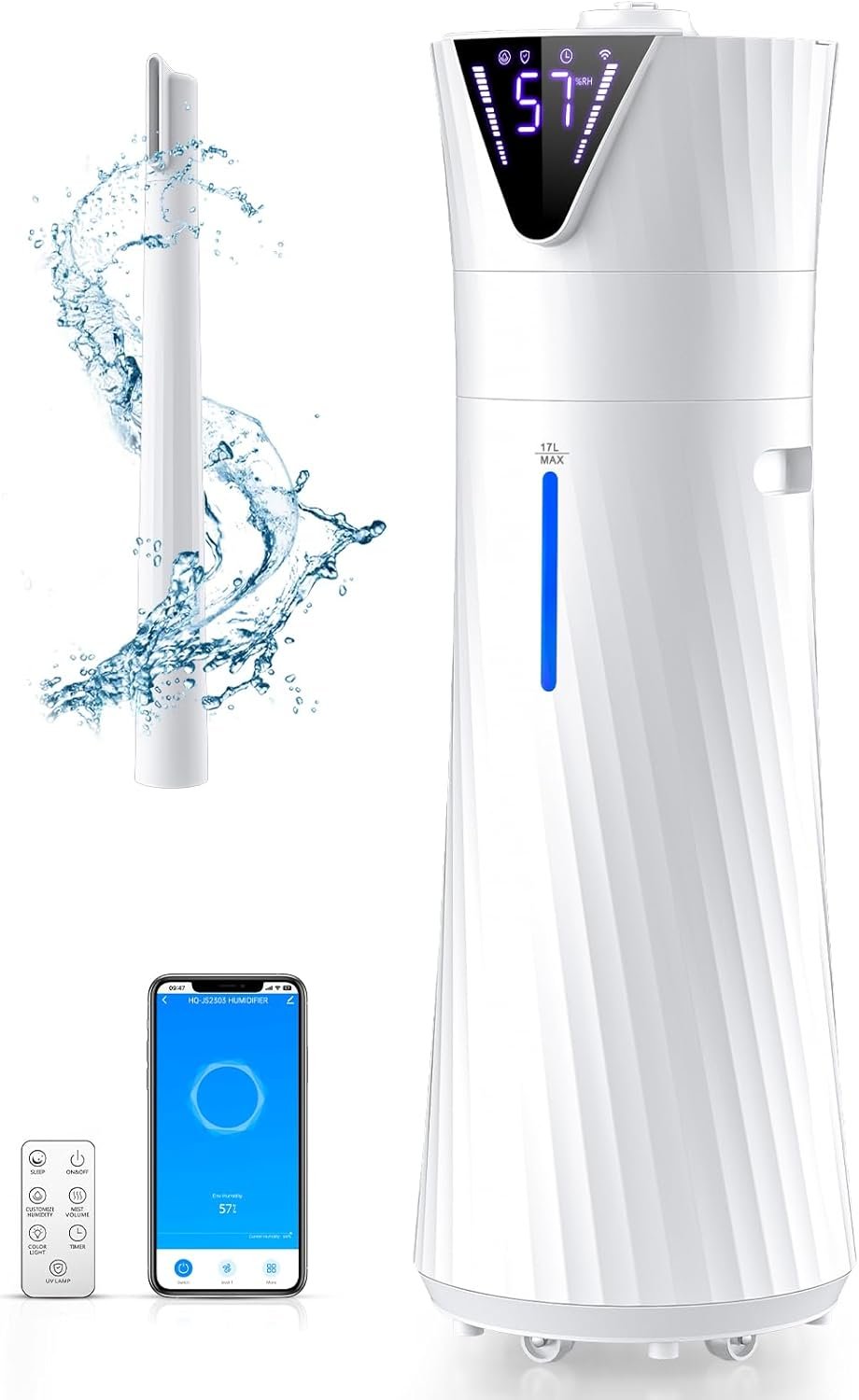 With its elegant hourglass-shaped design, this humidifier adds a touch of sophistication to any space. Its top-fill design simplifies refills, and the 1-24 hour timer ensures ensuring easy uninterrupted comfort. The machine will light up red as a warning due to the low water level and automatically shut off, ensuring safety without any concerns. This humidifier is compact and features 360º casters and a built-in handle, making it easy to move.